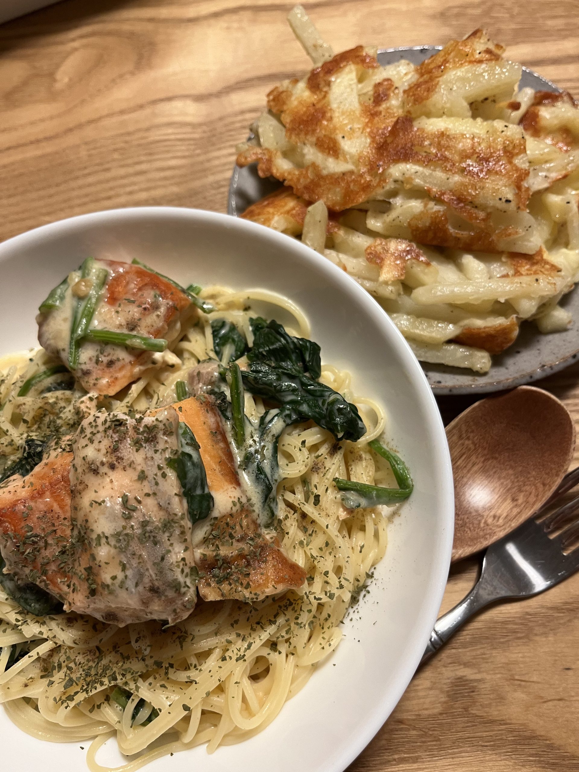 料理 失敗しない!鮭のクリームパスタ🍝 今日も夜ご飯を作らないと、、あ、お米がそんなになかったんだ、今日は何しよう?疲れてるし簡単なものがいいなあ💭 そんなときは!!パスタ!量も調節できるから便利! 今日は子供も好きな鮭のクリームパスタを紹介します✨ レシピ(1人前) パスタ 1... 2024.12.08 料理洋風