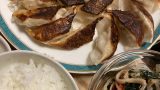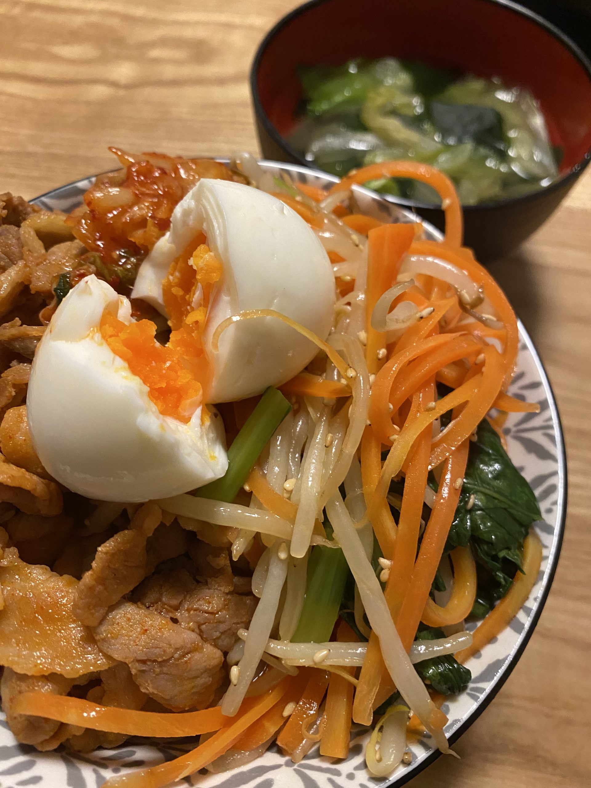 ⑤ごはんを皿に盛り、豚肉とナムルを盛り付ける お好みで半熟卵を添えてもおいしいです